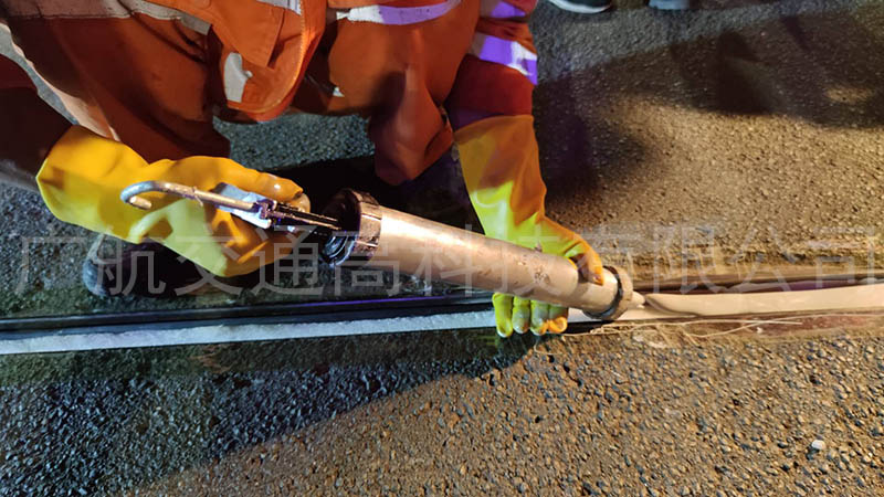 廣航交通液態止水膠廠家,研發新材料用于橋梁伸縮縫止水補漏,只需將液態止水膠注入清理干凈的伸縮縫槽內,自然養護40分鐘即可開放交通,相比傳統方式更換止水膠條,效率更高,效果更佳明顯。